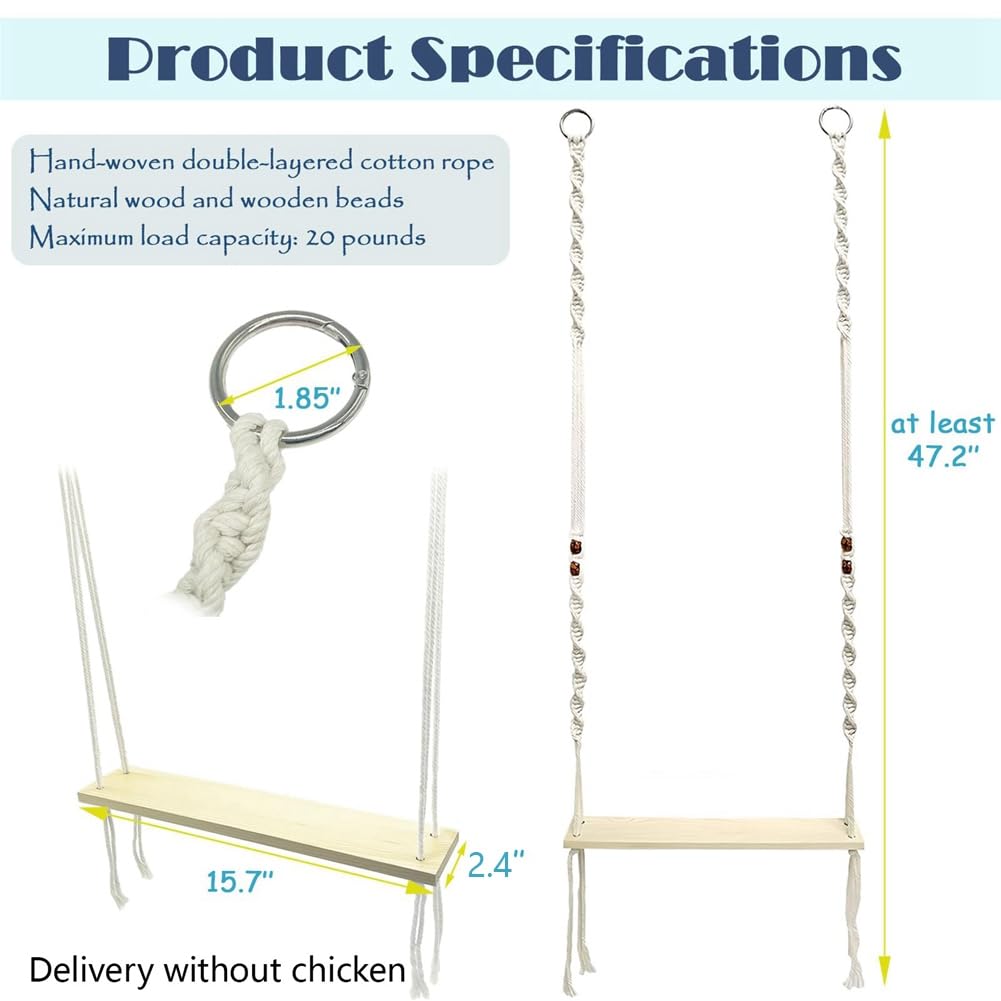 Coucou les éleveurs de poules ! Vos cocottes s'ennuient dans le poulailler ? Cette petite balançoire Haptufer est parfaite pour les occuper et les divertir. C'est un jouet simple mais bien pensé : une planchette en bois naturel suspendue par une corde en coton tressée à la main, double couche pour plus de solidité. Le tout est assemblé sans colle, donc aucun produit chimique nocif pour vos poulettes. La taille est idéale : la planche fait environ 15,7 cm de long sur 2,36 cm de large, et la corde est réglable jusqu'à 47,2 cm de longueur. Comme ça, vous pouvez l'adapter à la hauteur de votre poulailler. Les poules adorent les perchoirs en hauteur, ça les rassure et les amuse en même temps. L'installation est ultra facile : pas besoin d'outils, il y a des crochets aux extérieurs de la corde pour l'accrocher où vous voulez - au grillage, à une poutre, dans un parc à volailles... En plus d'être un jouet, c'est une jolie décoration de style bohème pour votre poulailler. Un cadeau original et utile pour tout amateur de poules ou pour vous faire plaisir à vous et à vos animaux. Préparez-vous à les voir se balancer et picorer joyeusement !