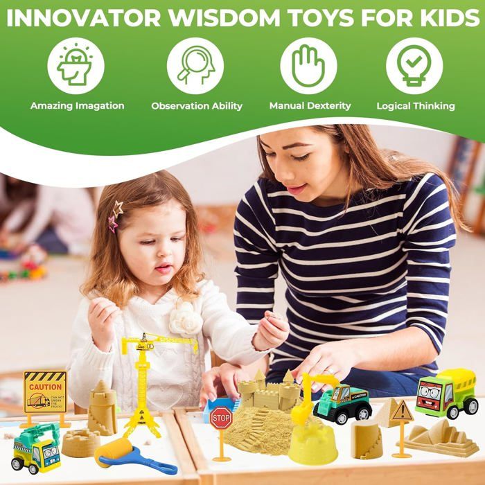 Votre enfant adore jouer avec le sable ? Ce kit ferme en sable magique va lui plaire à coup sûr ! Il contient 1 kg de sable sensoriel (qui ne sèche pas et se modèle facilement), des animaux, des légumes, des tracteurs détachables, des clôtures, des arbres… de quoi créer une vraie petite ferme.\n\nLe bac en plastique avec couvercle (38,8 x 25,5 x 9,1 cm) permet de tout ranger facilement et limite les dégâts. Le sable est facile à nettoyer et ne colle pas aux mains.\n\nParfait pour développer l'imagination, la motricité fine et jouer des heures sans s'ennuyer. Un cadeau génial pour un anniversaire, Noël, ou pour occuper les après-midi pluvieux. Les petits fermiers en herbe vont adorer !