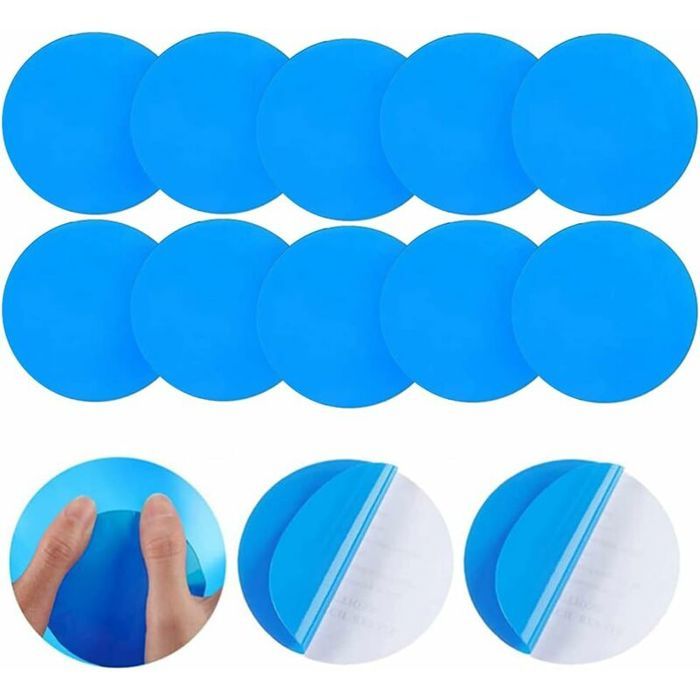 Votre piscine gonflable, bouée ou kayak a une fuite ? Ce kit de 10 rustines autocollantes va le sauver ! En PVC bleu, chaque rustine fait 10 x 25 cm, vous pouvez les découper à la taille voulue. La colle est forte et étanche, résiste à l'eau. Mode d'emploi : nettoyer la surface, décoller le papier protecteur, appliquer en appuyant bien. Convient aussi pour les lits à eau, ballons de plage, etc. Pratique à avoir dans son garage ou pour les vacances. Un must pour prolonger la vie de vos articles gonflables sans acheter du neuf. Livré en sachet.