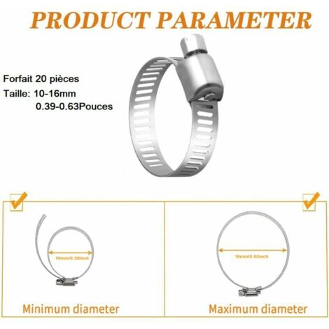 Tu cherches des petits colliers de serrage solides et fiables pour tes tuyaux d'eau, d'air, de carburant ou en silicone ? Ce lot de 10 colliers en acier inoxydable 304 est exactement ce qu'il te faut ! Ils sont disponibles en 8 diamètres réglables différents, allant de 6-8 mm jusqu'à 18-20 mm, donc tu trouveras forcément la taille qui correspond à ton projet.