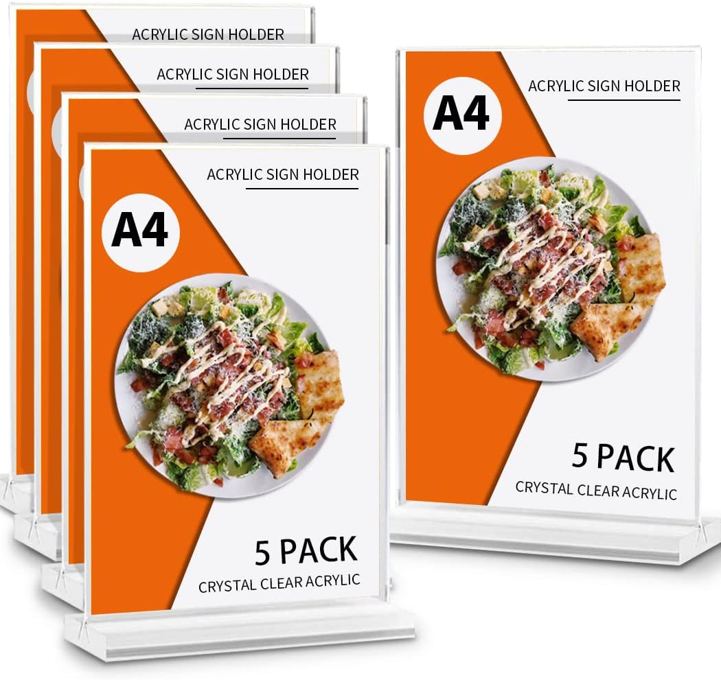 Tu cherches un support simple et élégant pour afficher tes menus, dépliants, photos ou annonces ? Ces présentoirs en acrylique transparent A4 (29,7 x 21 cm) sont parfaits ! En lot de 5, tu peux en mettre partout : au restaurant, au café, à la réception d'un hôtel, dans un magasin, ou même sur ton bureau.\n\nLa base en forme de T est épaisse (10 mm) et stable, avec une inclinaison à l'arrière pour une lecture facile. L'acrylique est ultra transparent, résistant aux rayures et facile à nettoyer. Tu glisses simplement ta feuille par le côté, sans outil, et hop, c'est affiché !\n\nIls sont légers mais solides, ne prennent pas de place une fois rangés, et donnent un look pro et moderne. Parfaits pour les commerçants, les exposants en salon, les offices de tourisme, ou pour organiser un événement (mariage, conférence…). Un accessoire polyvalent, pratique et qui dure dans le temps.