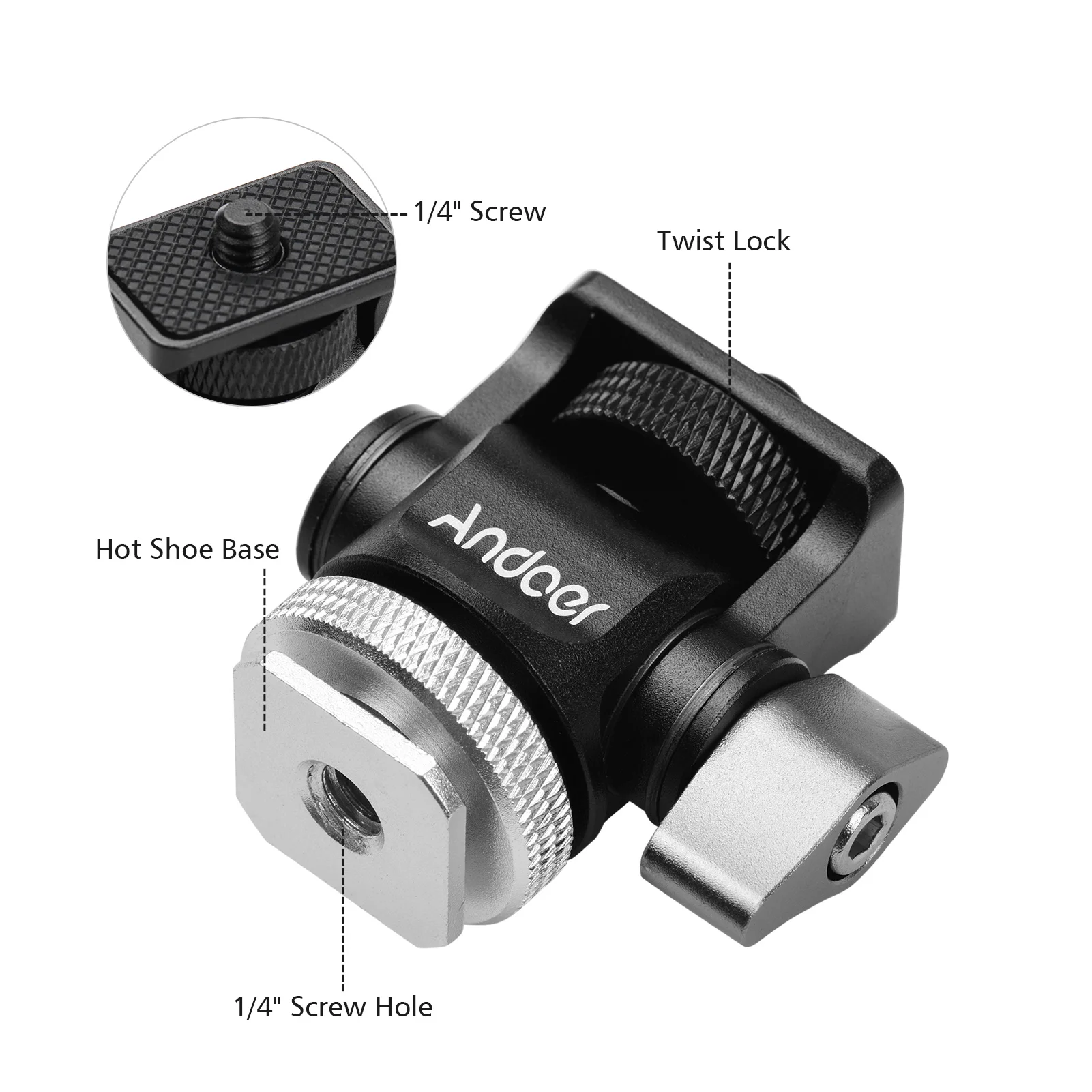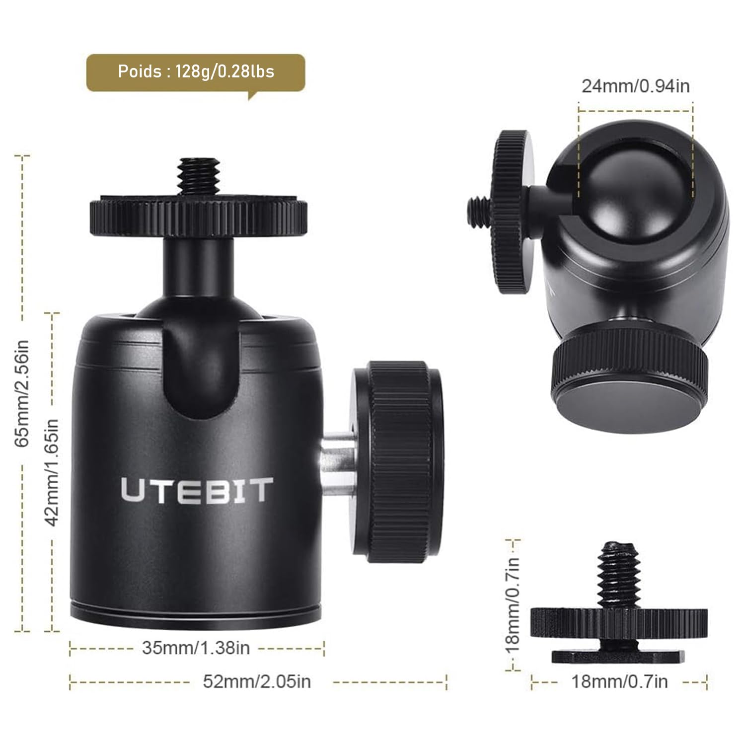 Hey les photographes et vidéastes ! Cette mini rotule UTEBIT est un accessoire super pratique pour monter votre appareil photo, micro, flash ou moniteur sur un trépied, monopode ou même une cage. Elle permet une rotation horizontale à 360° et une inclinaison de -90° à +90°, donc vous pouvez ajuster votre cadrage dans toutes les directions.\n\nElle est en alliage d'aluminium CNC, donc solide et légère (137 g). La charge maximale supportée est de 3 kg, suffisant pour un reflex avec un petit objectif ou un accessoire léger. Elle a un filetage mâle 1/4\ en haut et une griffe amovible en bas qui révèle un filetage femelle 1/4\.\n\nLes dimensions : hauteur 58 mm, diamètre de la rotule 20 mm. Le bouton de verrouillage permet de bloquer fermement la position. Compatible avec la plupart des appareils photo, caméscopes, lampes LED, etc. Un outil polyvalent, bien fini, à un prix très raisonnable. Parfaite pour les prises de vues créatives, les panoramiques ou simplement pour avoir plus de flexibilité sur votre trépied. Un petit must-have dans son sac !