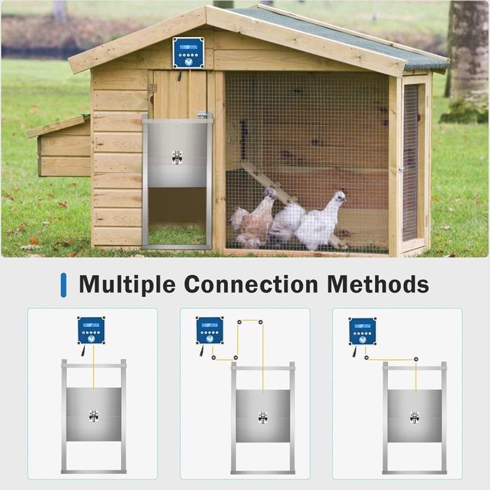Fini les tracas d'ouvrir et fermer le poulailler matin et soir ! Cette porte automatique fait tout le travail pour toi. Tu programmes facilement les heures d'ouverture et de fermeture sur le contrôleur (avec écran LED) en fonction de la saison et de la luminosité. Elle s'ouvre le matin pour laisser sortir tes poules, et se referme le soir pour les protéger des prédateurs (renards, belettes...). Tu peux aussi la passer en mode manuel si besoin. Elle fonctionne sur batterie (3 piles AA, non fournies) ou sur secteur (adaptateur inclus). Le cadre est en tôle de fer, la porte en alliage d'aluminium, donc robuste, résistante aux intempéries et légère. Dimensions de la porte : environ 28,5 x 20,5 cm. Montage simple avec vis et tournevis fournis. Poids total : environ 1,98 kg. Un accessoire qui te fait gagner du temps et assure la sécurité de tes poules, canards ou oies !