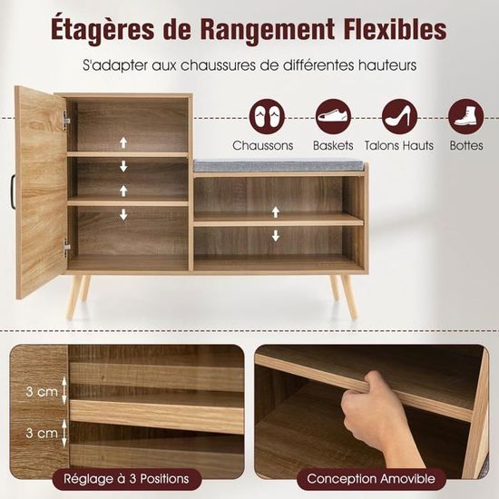 Côté rangement, tu as 10 cases au total : 6 petites (24x28x14 cm) et 4 grandes (24x28x22 cm). Parfait pour ranger des baskets, des escarpins, des bottines… Les deux étagères centrales sont réglables sur 3 hauteurs, donc tu t’adaptes à la taille de tes chaussures. En plus, sur le côté, il y a deux trous de 6 cm de diamètre pour glisser tes parapluies à long manche – plus de parapluies qui traînent par terre !
