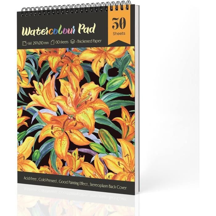 30 feuilles détachables au format A4, en 300 g/m², pressées à froid, avec une texture grain fin qui convient à toutes les techniques : humide sur humide, humide sur sec, glacis, lavis… Il résiste aux grosses quantités d’eau sans se déchirer, sans percer, et sèche lentement pour des mélanges subtils.