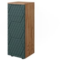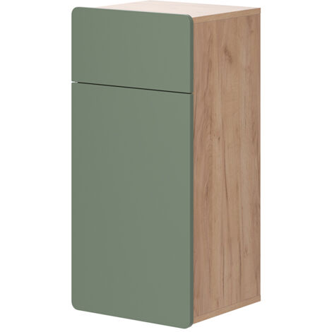 Le style est moderne, avec un corps en panneau de particules revêtu de mélamine couleur 'chêne doré' et une façade verte (la couleur peut varier selon les stocks). La surface est lisse et facile à nettoyer, ce qui est pratique dans une pièce humide.