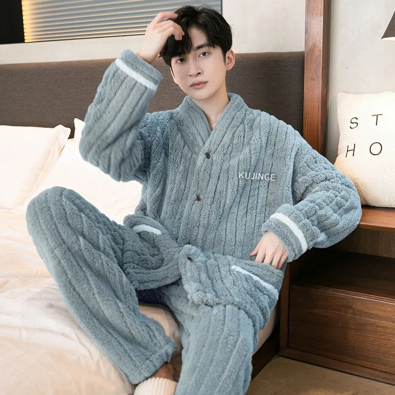 Pyjama Chaud Homme En Flanelle Polaire - Ensemble Haut Et Bas à Fermeture éclair, Manches Longues, Pour Nuit D'hiver Confortable