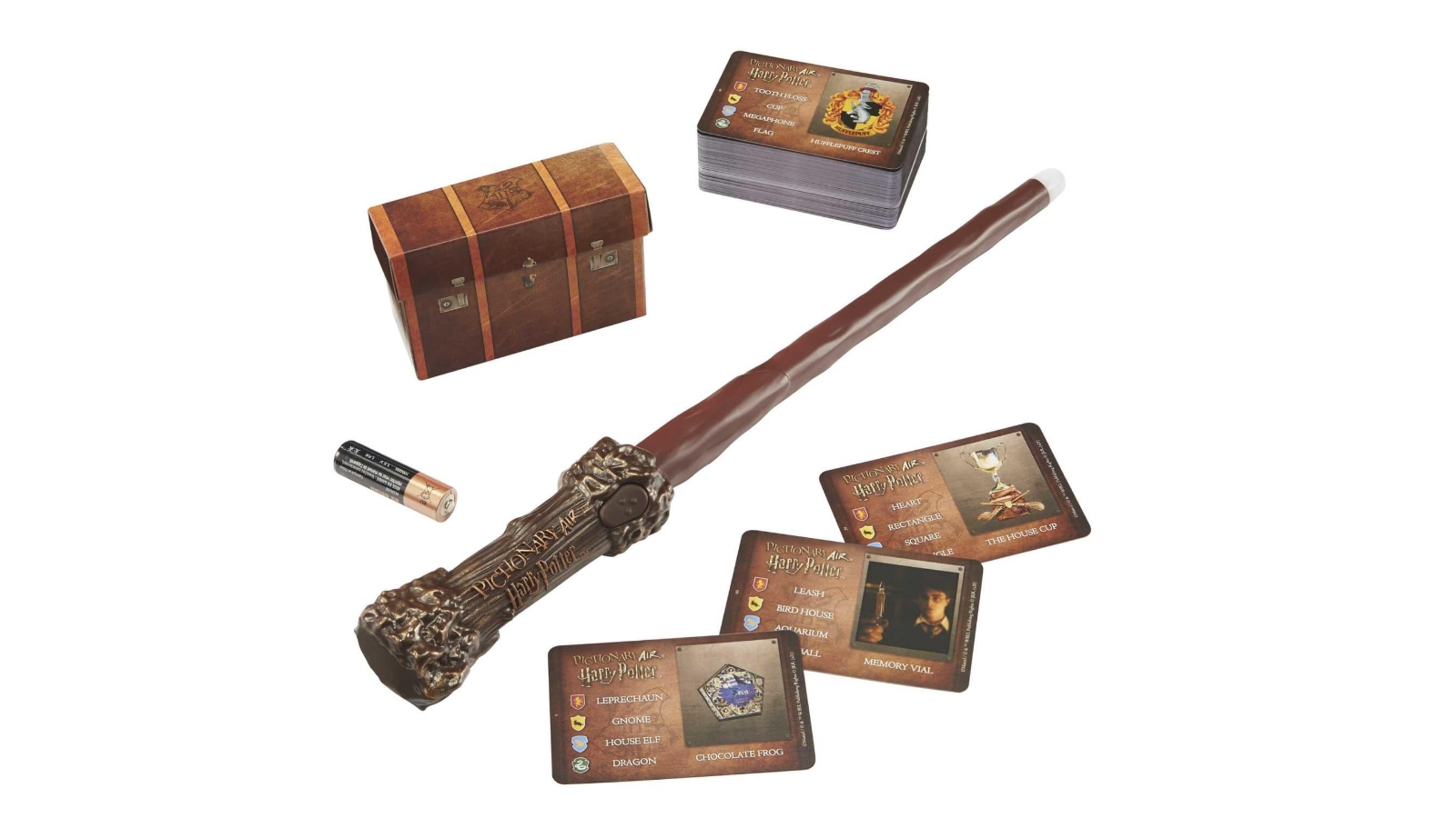 Plongez dans l’univers magique avec Pictionary Air Harry Potter ! Dessinez dans les airs avec la baguette de Harry, et voyez vos créations s’afficher sur l’écran de votre smartphone ou tablette via l’application gratuite. Les cartes sont inspirées de l’univers Harry Potter. Faites deviner à votre équipe en dessinant des indices. Diffusable sur TV via Apple TV, Chromecast, etc. Pour 2 équipes ou plus, à partir de 8 ans. Un jeu familial, interactif et immersif, parfait pour les soirées ou les fêtes. Attention : nécessite un appareil compatible pour l’application. Prêt à faire voler votre imagination ?