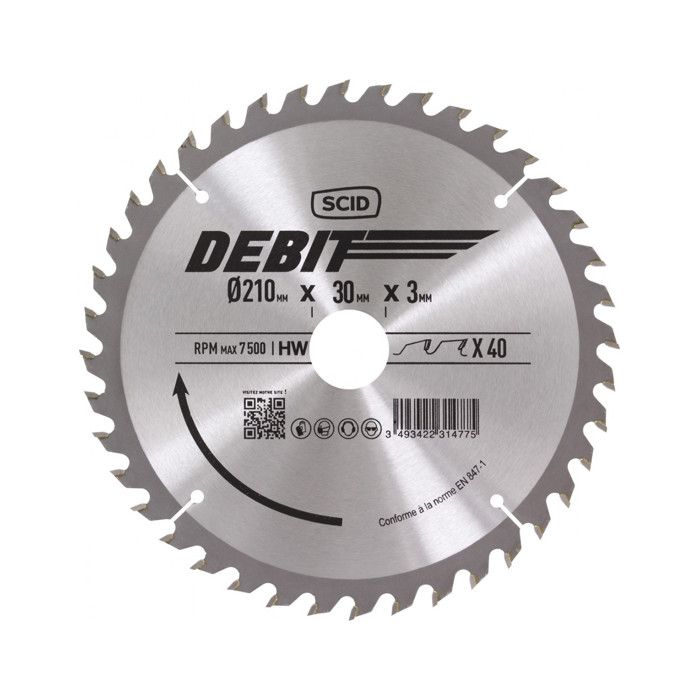 Caractéristiques techniques : diamètre 210 mm, alésage 25,4 mm (donc compatible avec les scies standard et les scies Evolution Rage sans adaptateur), épaisseur de coupe 2,4 mm, 40 dents.