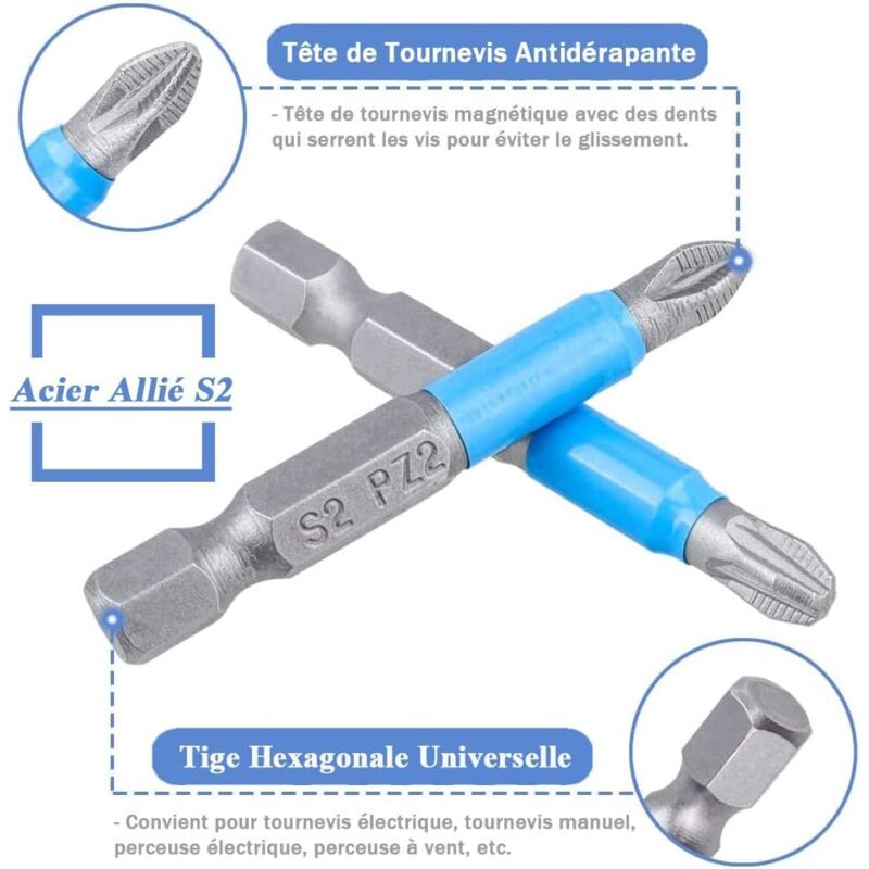 Salut les bricoleurs ! Ce lot de 6 embouts magnétiques, c’est l’accessoire indispensable pour tous tes travaux de vissage. Tu as 6 tailles : 25, 50, 65, 75, 100 et 150 mm – de quoi s’adapter à presque toutes les vis. Fabriqués en acier au carbone haute dureté, ils résistent à l’usure et ne se déforment pas. Le magnétisme puissant maintient la vis en place : plus de vis qui tombent ! L’embout antidérapage épouse parfaitement la tête de vis, évitant les glissements et les rayures. Compatible avec les tournevis électriques, manuels, les poignées en T 1/4” et même les visseuses à percussion. Parfait pour monter des meubles, réparer des appareils électroniques, bricoler sur la voiture… Le kit inclut un magnétiseur bleu pour renforcer l’aimantation si besoin. Un gain de temps et d’efficacité assuré. Fini les galères avec les vis récalcitrantes – avec ces embouts, tout devient plus fluide. Et en plus, ils tiennent longtemps. Un achat malin pour la maison ou l’atelier.