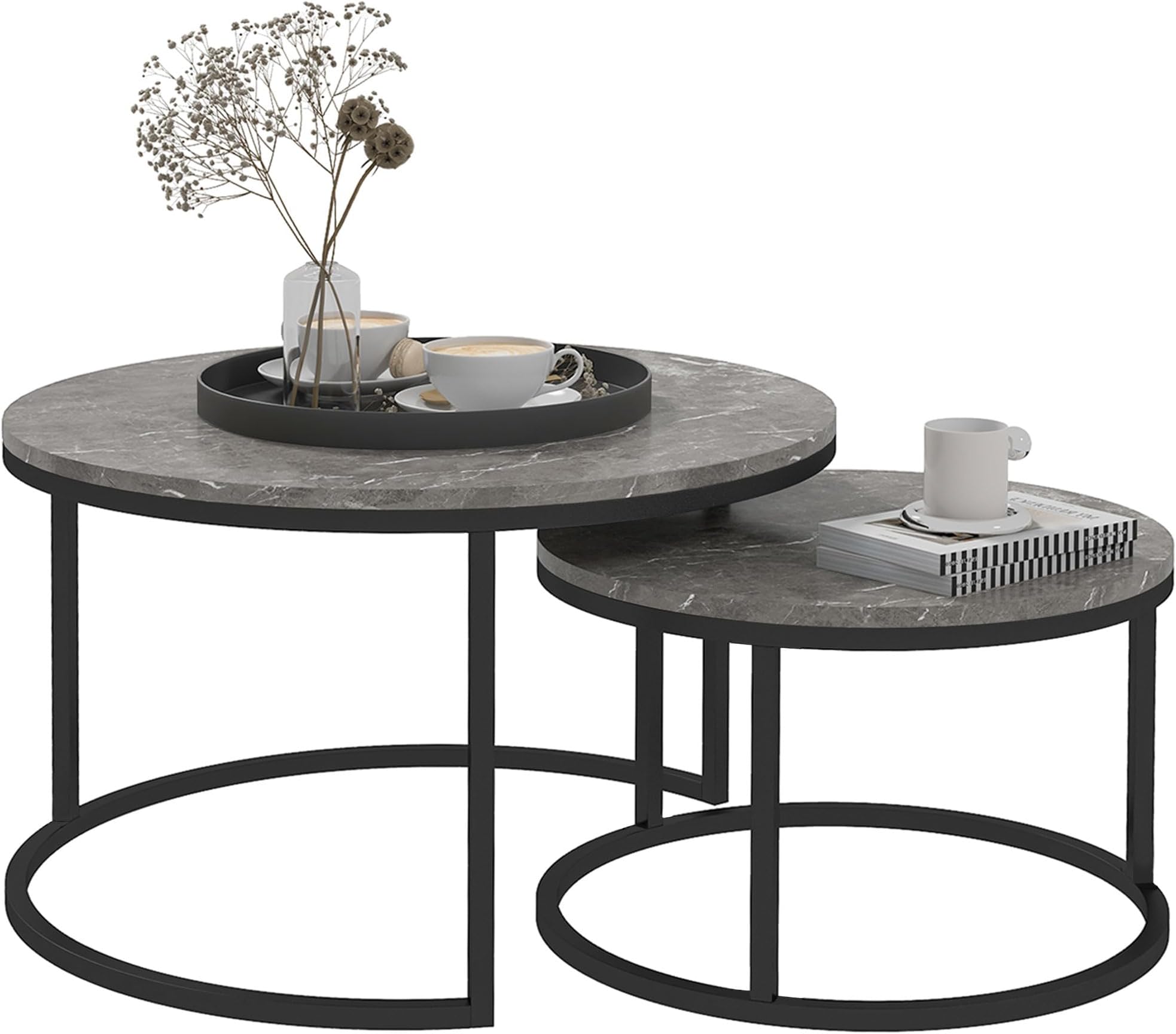 Décoration Salon Moderne Marbre Lot De 2 Tables Basses Gigognes Rondes Effet Marbre - Pieds Métal Noir - Dimensions 70x70 Cm Et 54x54 Cm Table Basse Scandinave Salon