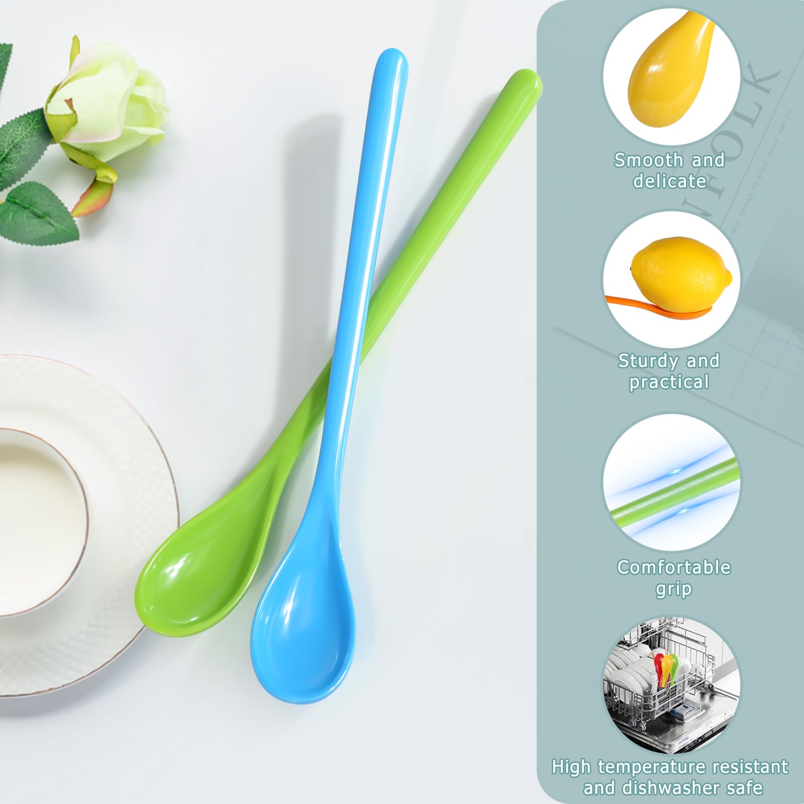 Besoin de cuillères pratiques, colorées et solides pour la cuisine ? Ce lot de 10 cuillères à œufs en plastique est idéal ! Elles mesurent 18,5 cm de long, parfaites pour atteindre le fond des pots de confiture, des yaourts, ou pour mélanger des boissons dans des grands verres. En plastique de qualité, elles sont incassables (ou presque !) et réutilisables. Les couleurs vives (rose, rouge, orange, bleu, vert...) égayent la table et aident à distinguer les cuillères si chacun a la sienne. Tu peux les utiliser pour les desserts, le café, les œufs à la coque, les épices... Et le grand plus : elles passent au lave-vaisselle. Un petit prix pour un set hyper pratique au quotidien, en famille ou pour recevoir. Parfait aussi pour les pique-niques ou les goûters d'enfants !