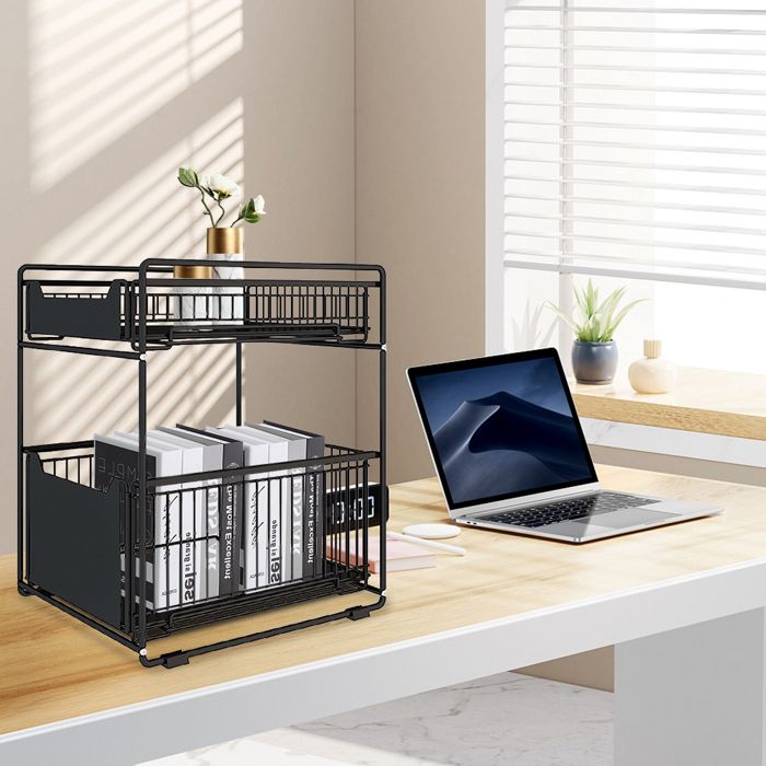 Pour optimiser l'espace sous ton évier, dans un placard, ou même dans une armoire de salle de bain, cet organisateur à deux niveaux avec paniers coulissants est génial. En acier inoxydable avec finition noire, il est solide, résistant à la rouille et facile à nettoyer.