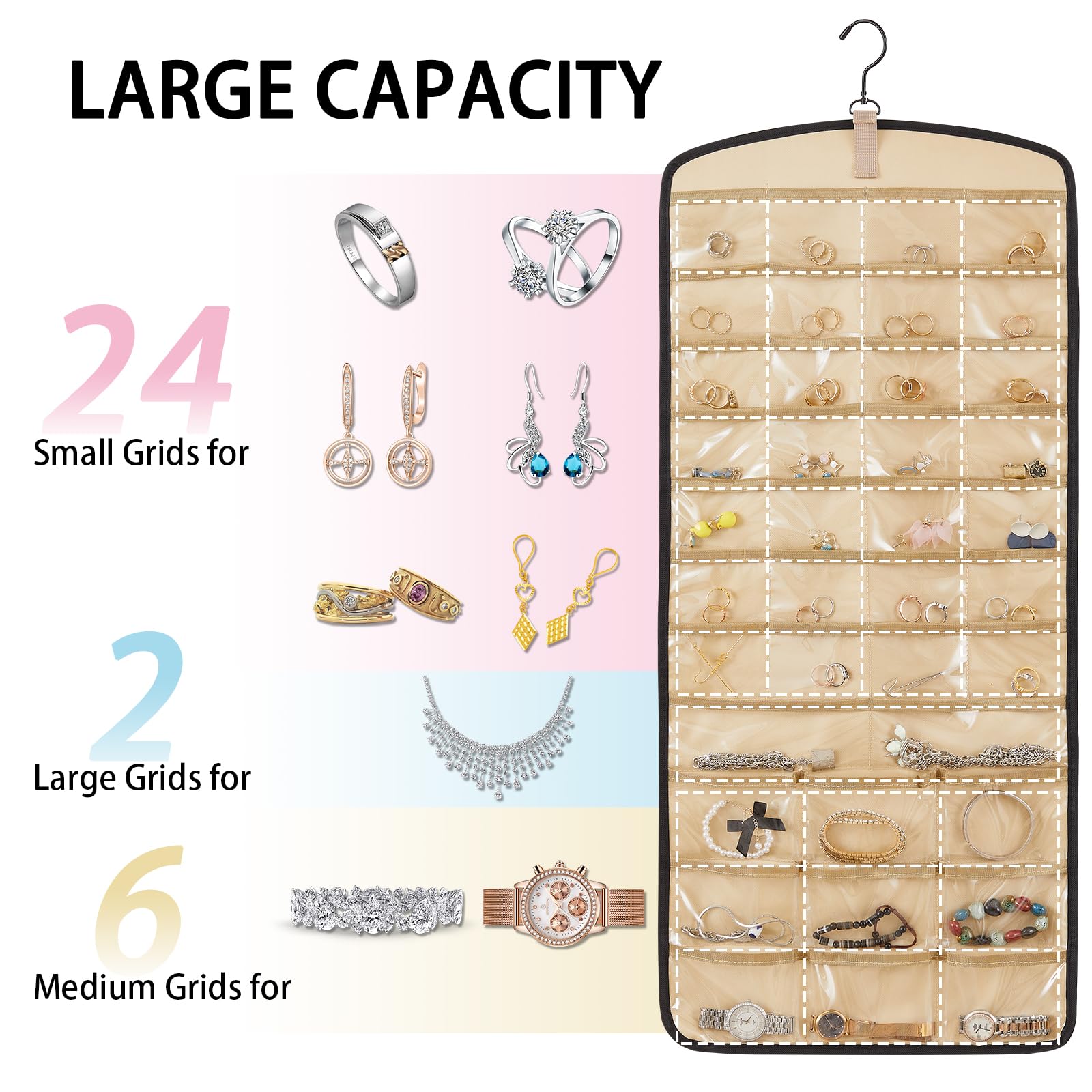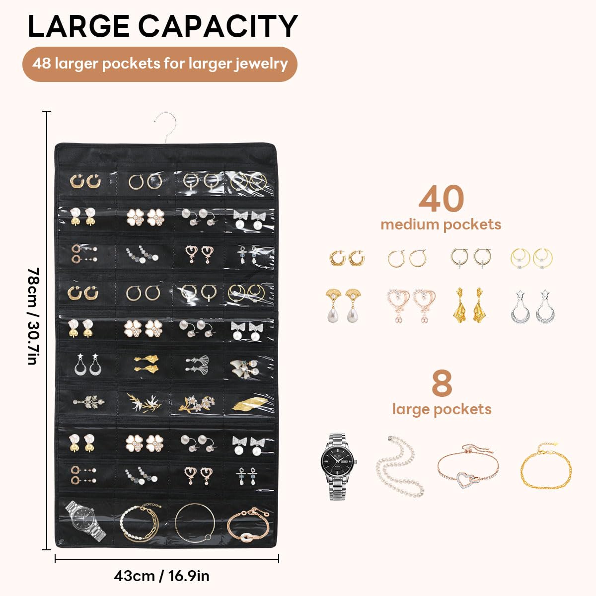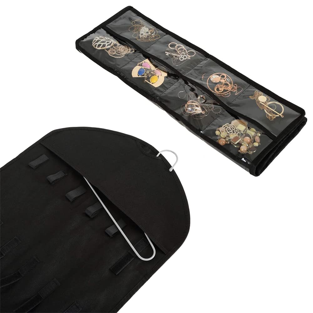 Support Bijoux Organisateur Bijoux Suspendu Double Face – Poches PVC Transparent – Pour Boucles, Colliers, Bagues – Gain De Place, Noir Rangement Bijoux Double Face