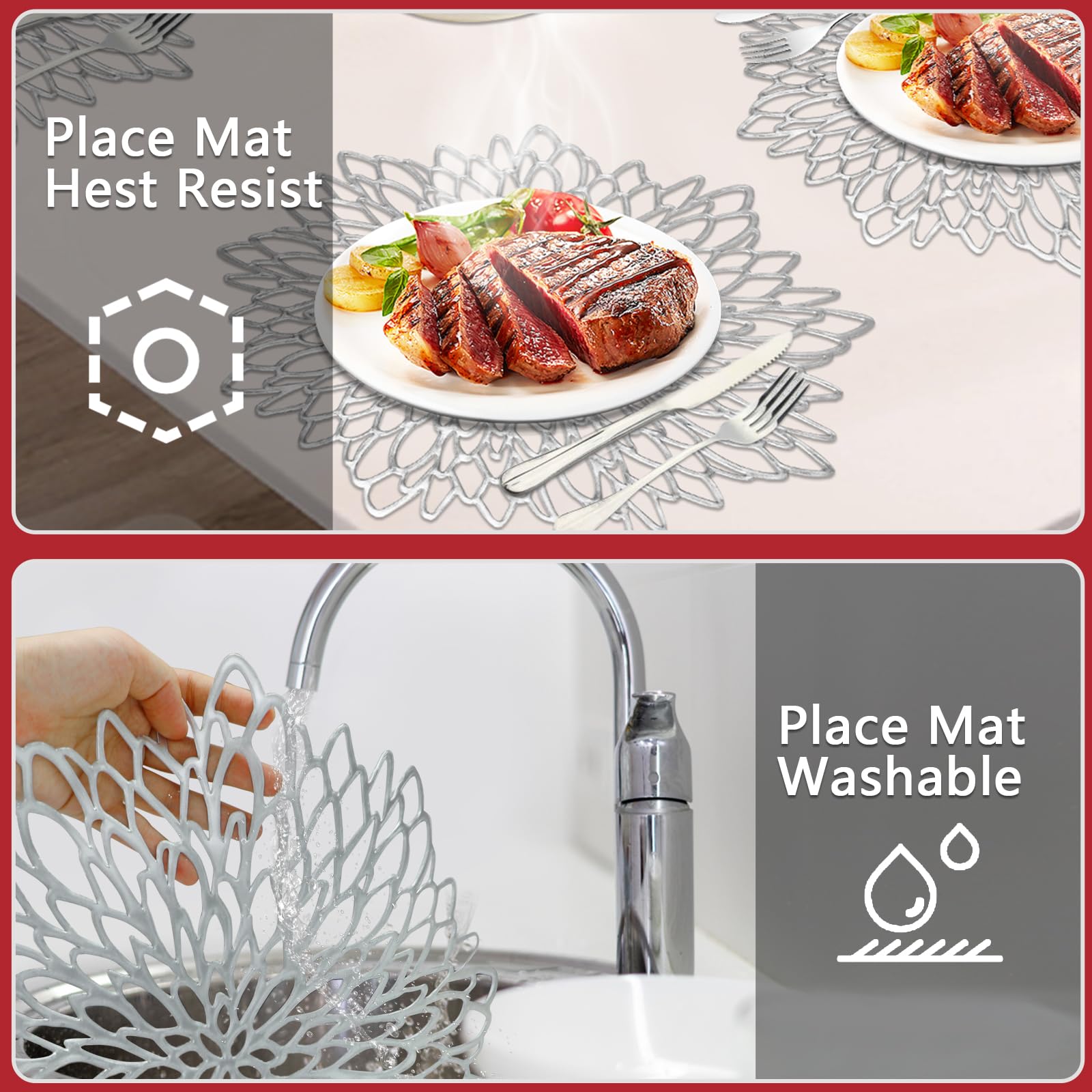 Coucou ! Pour protéger ta belle table à manger des traces de verres, des coups de couteau ou des taches, ces sets de table ronds sont parfaits. Le lot comprend 6 napperons, chacun d’un diamètre de 32 cm (12.6 pouces). Ils sont en polypropylène tissé, une matière durable, qui ne se décolore pas facilement et qui résiste bien. Le design est simple et élégant, dans une jolie couleur bleue qui s’accorde avec beaucoup de styles. Ils sont légèrement texturés, ce qui empêche les assiettes de glisser. Tu peux les utiliser au quotidien, mais aussi pour des occasions spéciales : mariage, anniversaire, Noël, pique-nique… Entretien hyper facile : un coup d’éponge humide ou un rinçage à l’eau, et c’est propre. Attention, ne pas les mettre en machine à laver (c’est du tissé, ça pourrait se déformer). Ils ne sont pas complètement étanches (le liquide peut passer à travers les mailles), mais ils protègent bien des rayures et des chocs. Un petit investissement pour garder ta table impeccable et ajouter une touche de déco à tes repas !