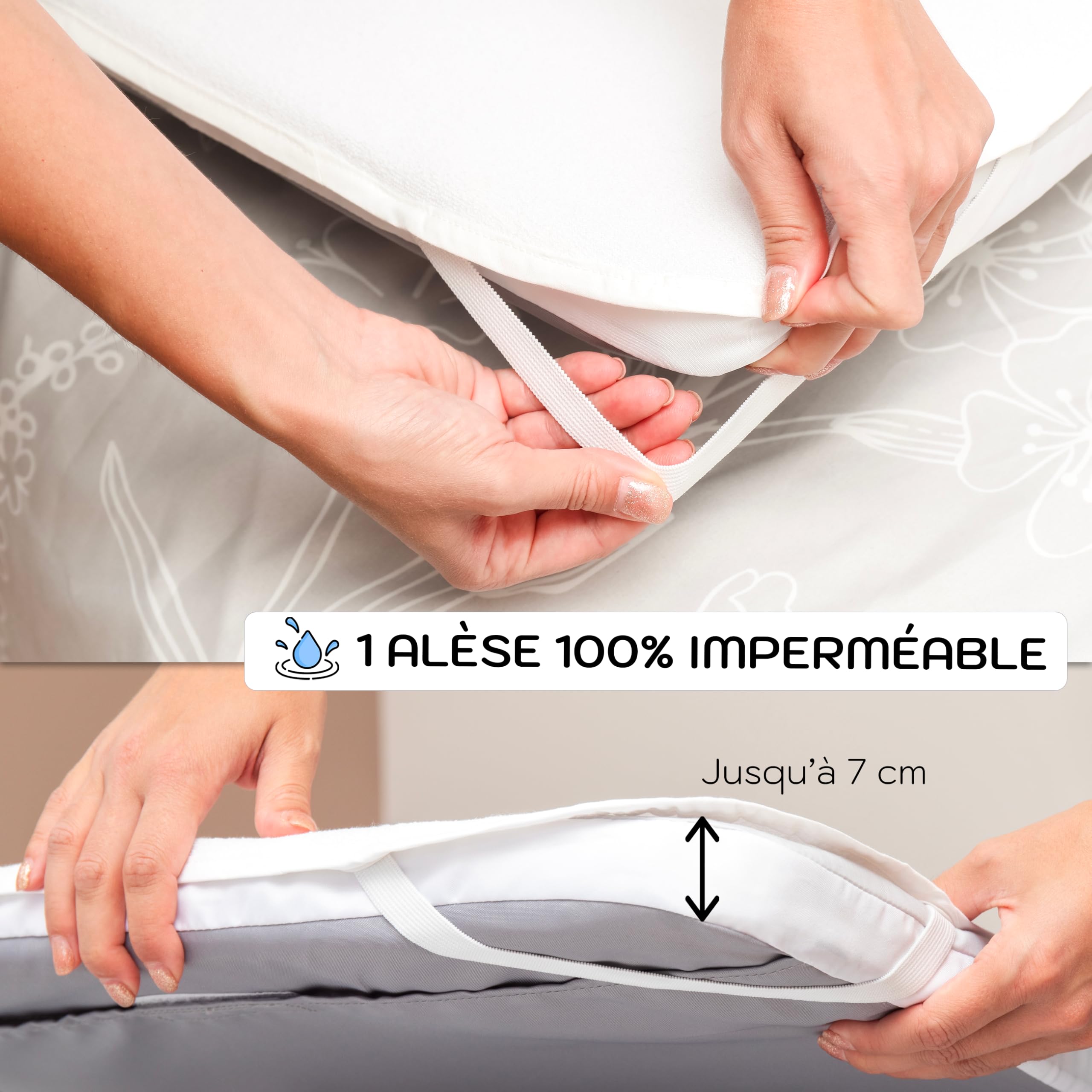 Pour protéger le matelas de votre bébé des fuites, régurgitations et transpiration, cette alèse imperméable Lovely Hippo est idéale. Au format 50 x 89 cm, elle s'adapte parfaitement aux matelas de cododo, lits parapluie ou petits lits bébé. Elle est 100% imperméable grâce à une couche étanche, tout en ayant une face en coton douce et absorbante au contact de bébé. Cerise sur le gâteau : elle est certifiée Oeko-Tex, donc sans produits chimiques nocifs, pour la santé de votre enfant et le respect de l'environnement. Pratique, elle possède un élastique tout autour pour un maintien facile et serré sur le matelas. En plus, elle est lavable en machine à 60°C, ce qui permet de bien éliminer les taches et les acariens. Résistante et durable, c'est une protection essentielle et saine pour le couchage de bébé. Un indispensable de la layette !