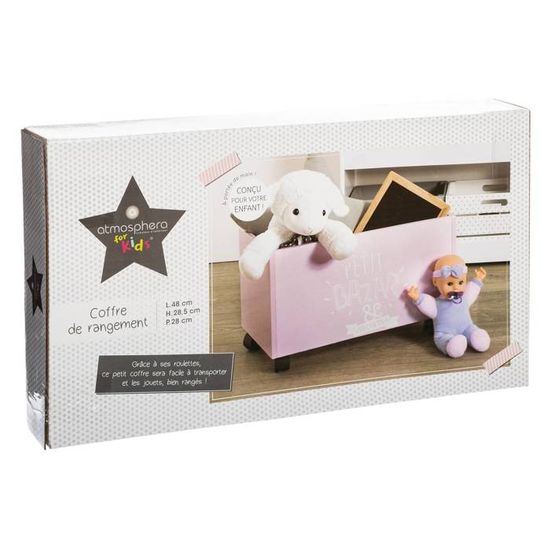 Coucou les parents ! Ce coffre Atmosphera est parfait pour ranger les jouets, les peluches ou les vêtements dans la chambre des enfants. En bois (MDF) finition blanc/gris, il est à la fois pratique et décoratif.\n\nLes dimensions sont de 58 cm de long, 37,5 cm de profondeur et 49,5 cm de haut – assez spacieux sans être encombrant. Il a de petits pieds en pin (2,5 cm de haut) pour le surélever légèrement.\n\nIl est à monter soi-même, mais c'est simple et rapide (notice incluse). Une fois assemblé, il est solide et stable. Le couvercle s'ouvre facilement pour un accès rapide au bazar dedans !\n\nEn plus de servir de rangement, il peut faire office de banquette ou de table basse miniature. Design doux et moderne, il s'intègre bien dans une déco enfant ou même un salon. Pour garder la chambre un peu plus rangée… ou au moins cacher le désordre !