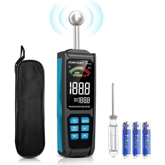 Tu veux vérifier si ton bois de chauffage est assez sec, si un mur a une infiltration ou si un plancher est prêt à être poncé ? Ce testeur d’humidité sans aiguille est l’outil idéal.\n\nIl mesure sans piquer ni abîmer la surface, grâce à des capteurs électromagnétiques. Tu poses simplement l’appareil sur le matériau, et en quelques secondes, le taux d’humidité s’affiche sur l’écran LCD couleur.\n\n4 modes de mesure : bois dur, bois tendre, mur, maçonnerie. Tu peux régler un seuil d’alarme — une sonnerie et un voyant rouge se déclenchent si le taux est trop élevé.\n\nFonctions pratiques : HOLD (gel de la mesure), auto-extinction, indicateur de batterie faible. Livré avec piles.\n\nIdéal pour : bricoleurs, charpentiers, poseurs de parquet, chauffagistes, propriétaires qui veulent éviter les problèmes d’humidité. Précision environ ±4%.\n\nUn appareil pro, simple d’usage, pour des diagnostics rapides et fiables.