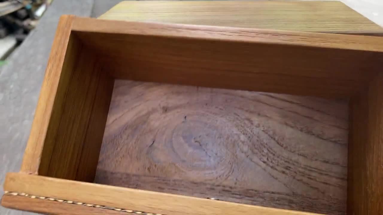 Il comporte trois tiroirs qui coulissent facilement (grâce à une rainure au-dessus de chaque) et un grand compartiment ouvert sur le dessus, protégé par des rebords sur trois côtés pour éviter que les objets ne tombent.