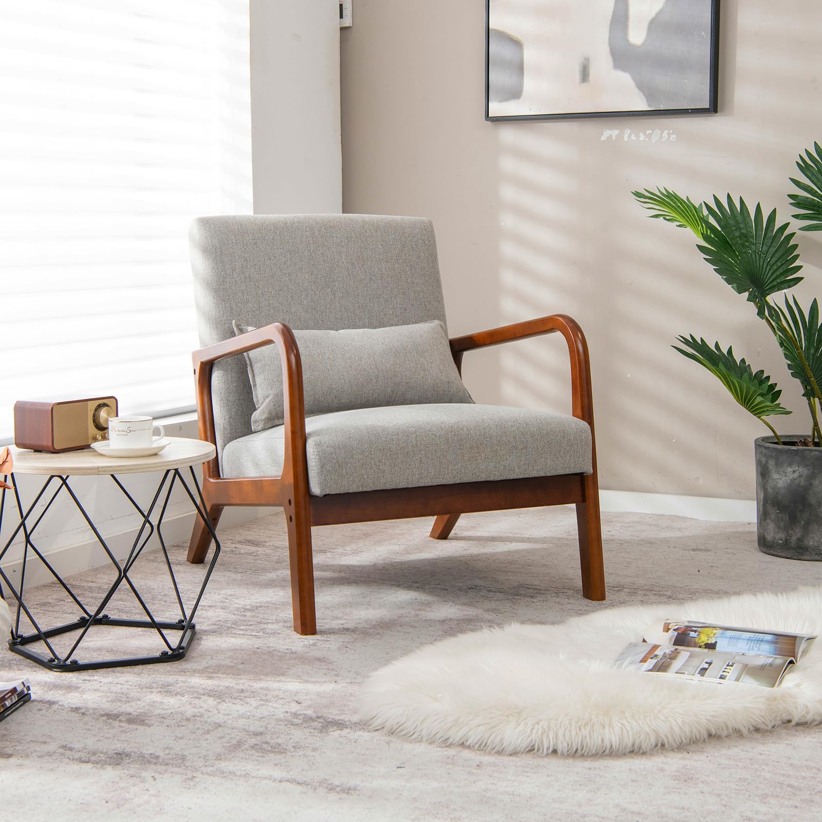Chaise D'appoint Moderne Velours Et Bambou - Style Milieu Du Siècle, Tissu Lin, Accoudoirs Rotin - Confort Rembourré, Capacité 114 Kg, Pour Salon, Bureau