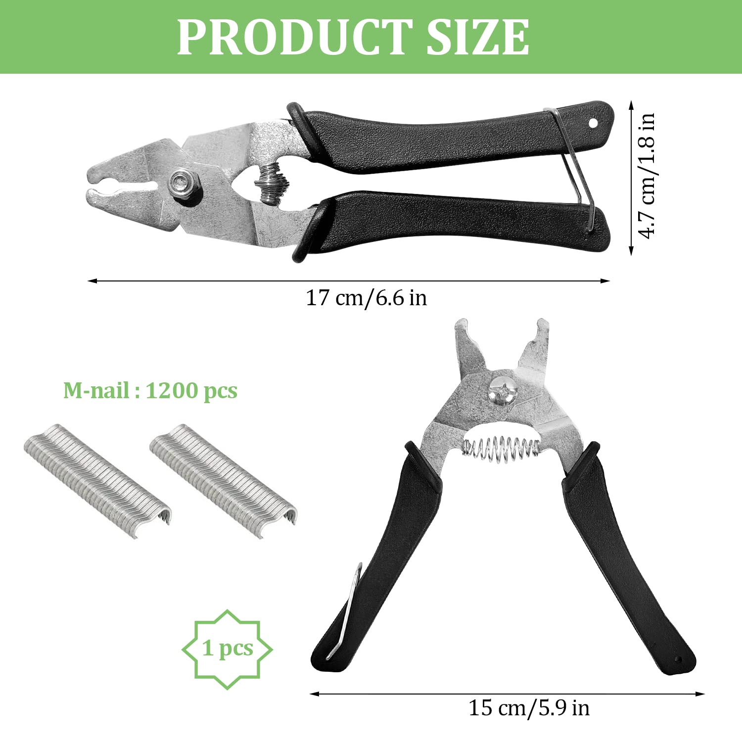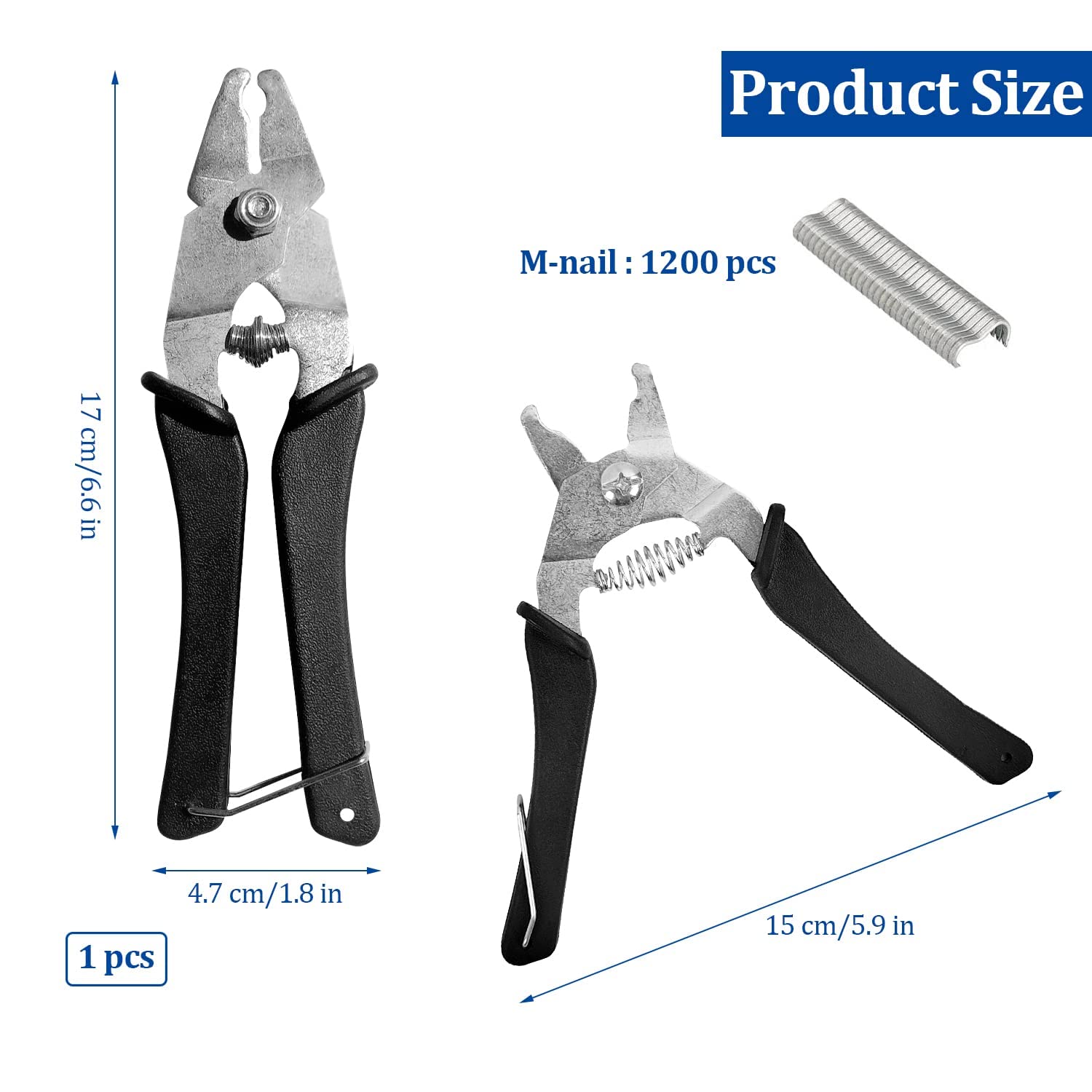 Elle est livrée avec 1200 agrafes de type M (en fil d'acier galvanisé) : il suffit de placer l'agrafe, de serrer la pince et le tour est joué ! Gain de temps énorme par rapport au fil de fer et à la pince classique.