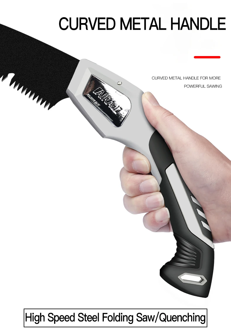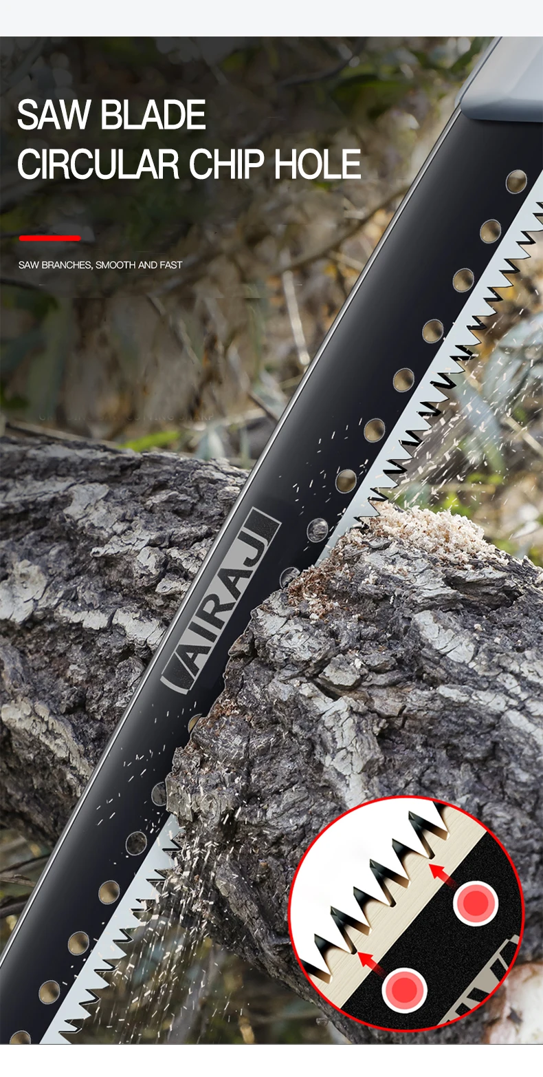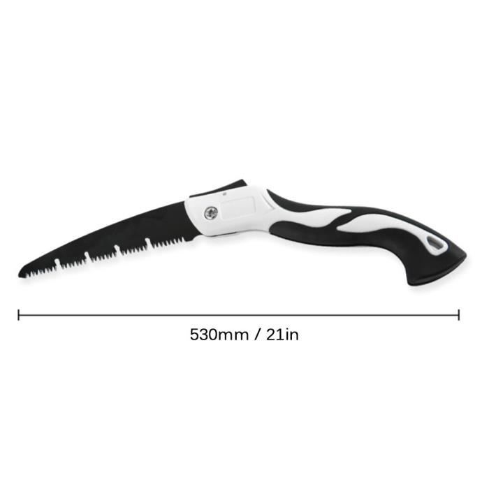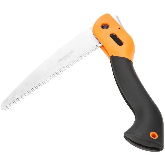 Pour tailler vos arbres, couper du bois en camping ou bricoler au jardin, cette scie pliante Yuecoom est l'outil qu'il vous faut ! La lame est en acier SK-5 à haute teneur en carbone, avec un revêtement anti-rouille et des dents affûtées sur trois côtés pour une coupe rapide et nette. La longueur de la lame est d'environ 250 mm, et la poignée ergonomique de 300 mm est recouverte de caoutchouc souple antidérapant pour un bon confort d'utilisation. La scie se plie et se verrouille facilement, ce qui la rend sûre à transporter et à ranger. Le système de verrouillage maintient bien la lame en place pendant le sciage. Elle est légère, maniable, et convient aussi bien aux travaux de jardinage qu'à la survie en plein air. Les copeaux ne s'accumulent pas grâce à la rainure dentelée, et le bruit est réduit. Un outil polyvalent, robuste et pratique pour tous les amoureux du bricolage.